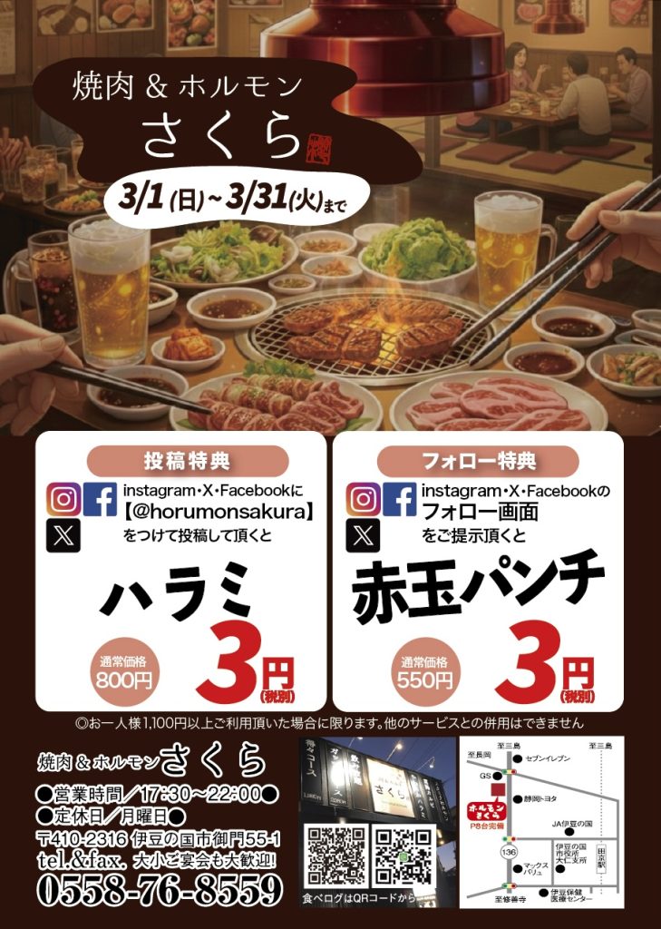 <今月の投稿特典>Instagram・X・Facebookに『@horumonsakura』をつけて投稿していただくとハラミ 3円